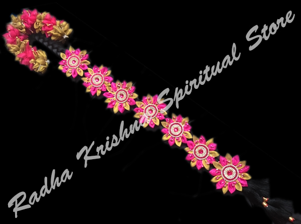 This beautiful artistic artificial flower 1 veni gajra each 10 inch total length with seperate motifs in gold floral shape embraced with stones and buds. It is intricately handcrafted with best quality very soft cloth. Each length is of 3cm width. This veni gajra hair decoration is crafted in vivid hues of pink and gold.