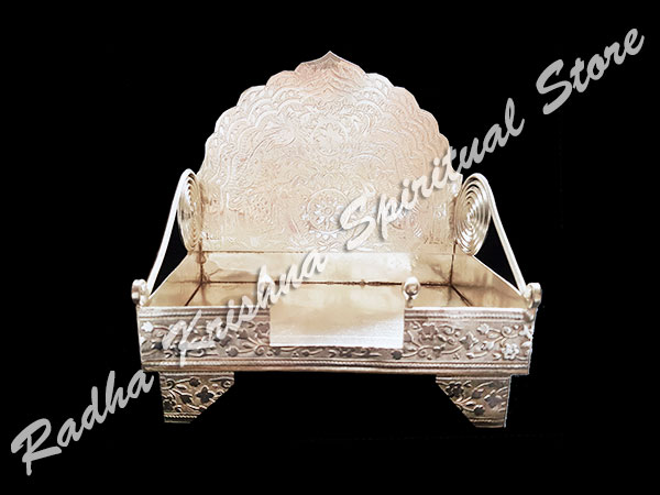 This 2.75 inch length by 3.5 inch height by 1.5 inch depth silver plated "Singhasan" or throne with elephant carvingon the head area used for sitting or placing deities in the pooja alter or temple or mandir. This is made of metal alloy with pure silver plating which does not turn black easily.